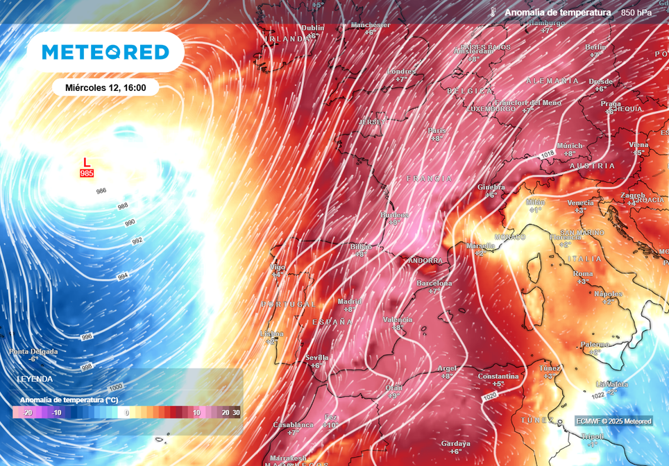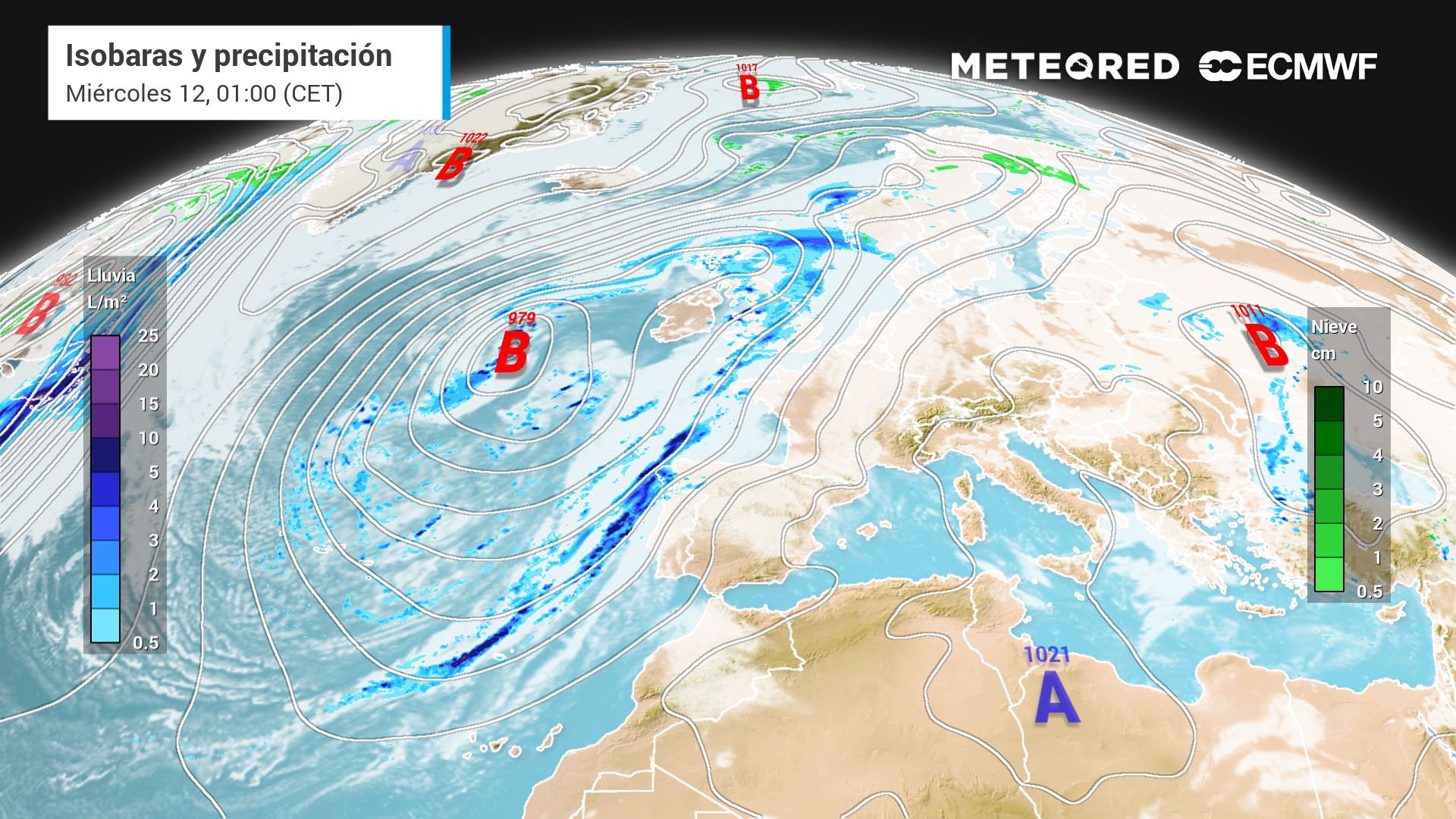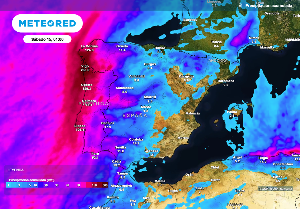 Entre el miércoles y jueves, seguiría lloviendo de forma abundante en Galicia, pero la dorsal impedirá que el frente se adentre en la Península, por lo que las lluvias quedarían ancladas en esta comunidad. Es muy probable que de aquí al viernes se registren 200 l/m2 o más en las Rías Baixas y puntos del suroeste de A Coruña. Las lluvias también se intensificarán desde el miércoles, siendo localmente intensas y tormentosas.