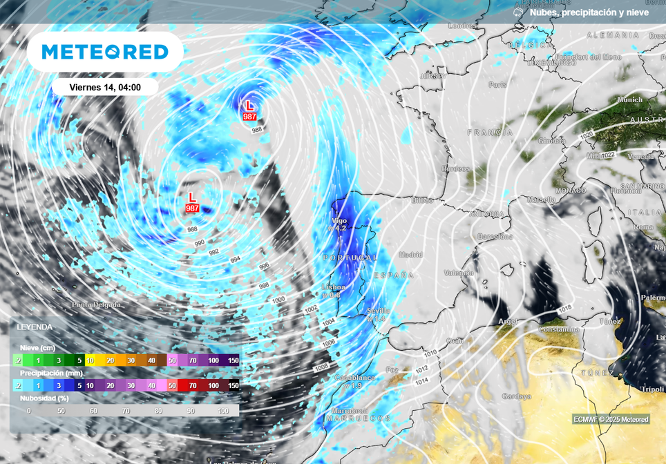 La semana que viene será lluviosa en la vertiente atlántica peninsular y en Canarias. El máximo pluviométrico nacional se lo llevará Galicia, con acumulados superiores a los 200 l/m2 en las Rías Baixas.