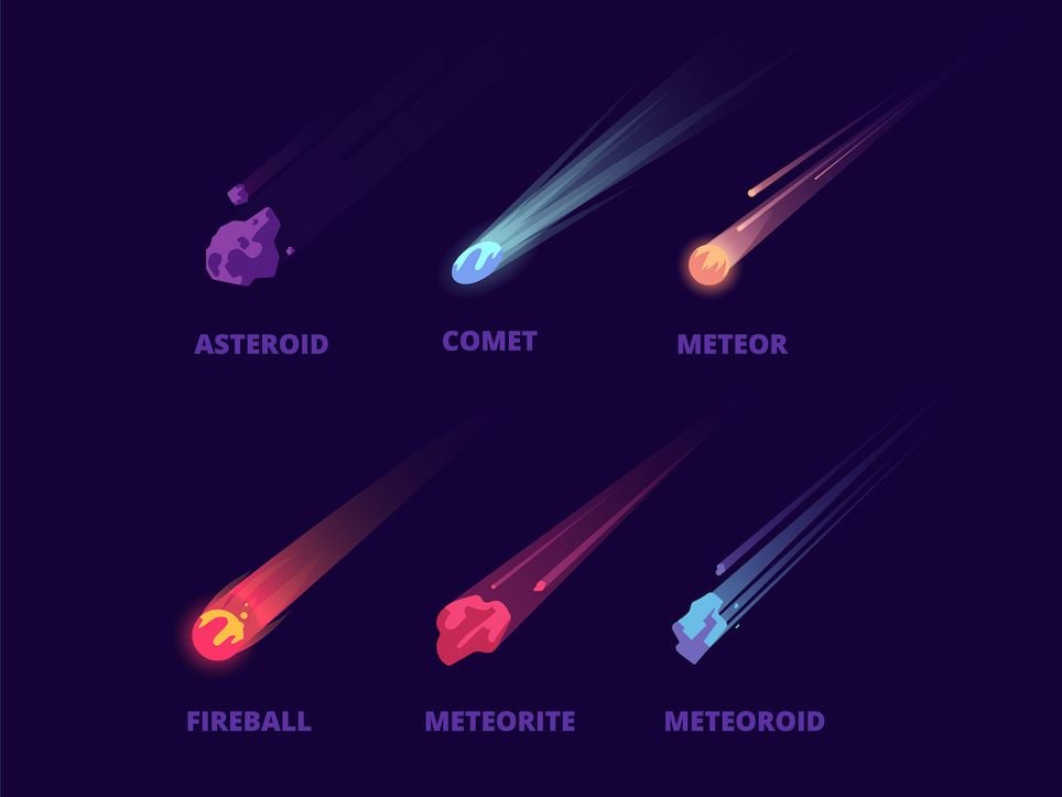 Básicamente, son fragmentos de roca, hielo o metal, la distinción principal radica en su composición y su apariencia al ser observados. Los asteroides son típicamente rocosos, mientras que los cometas están formados por una mezcla de hielo y polvo. Y los meteoros son, fragmentos mucho más pequeños de estos cuerpos.