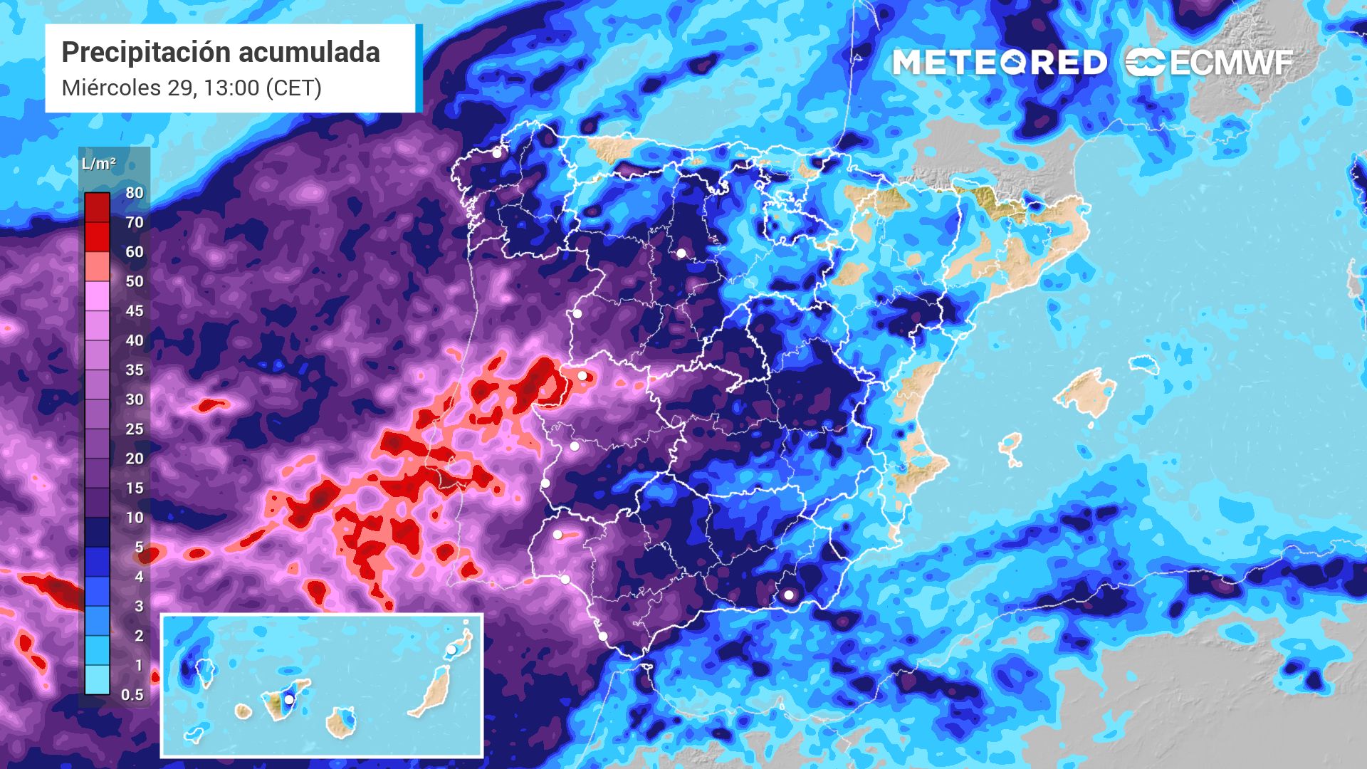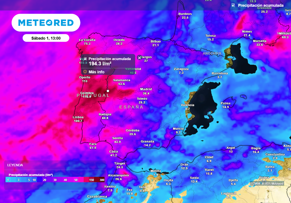 Según el modelo europeo, a lo largo de la semana se acumularán más de 200 l/m² de forma local en el sector occidental del Sistema Central, mientras que sobrepasarán los 100 l/m² en el oeste y sur de Galicia, entorno del lago de Sanabria, comarcas occidentales de Castilla y León y sierras del oeste de Castilla y León. En contraste, en zonas del litoral mediterráneo y Baleares no lloverá prácticamente nada.
